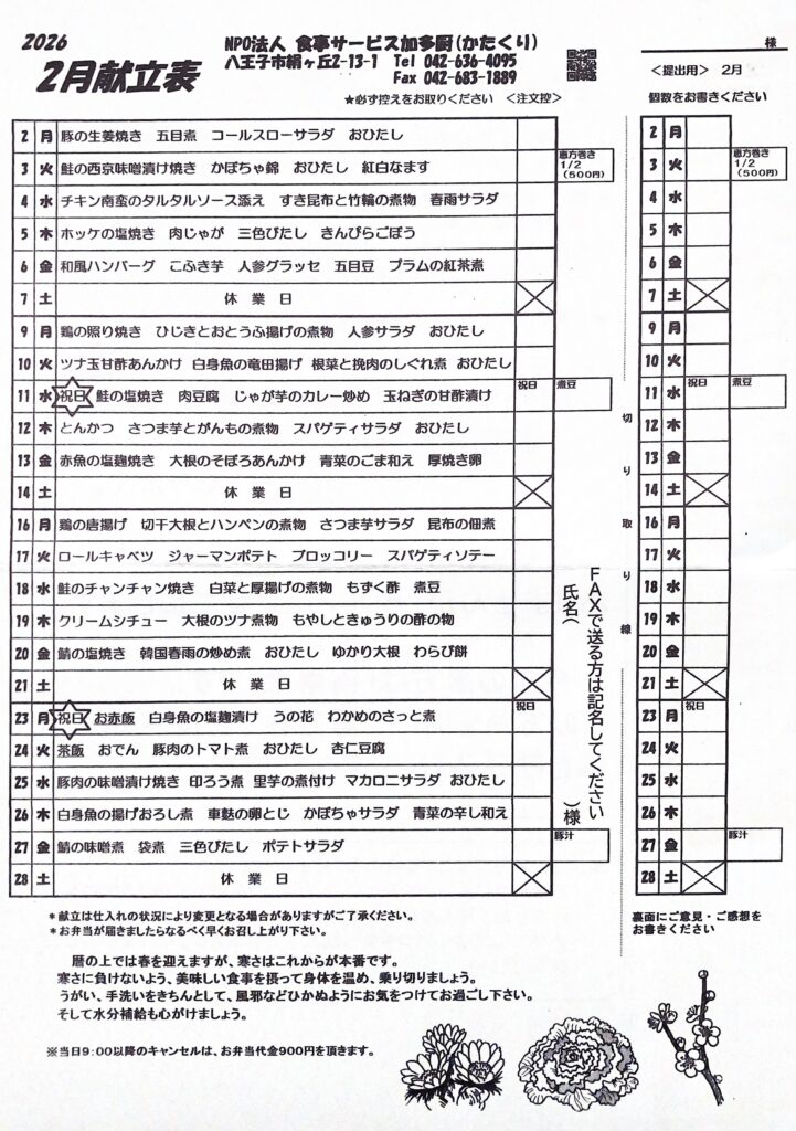 2月の献立表を追加しました。